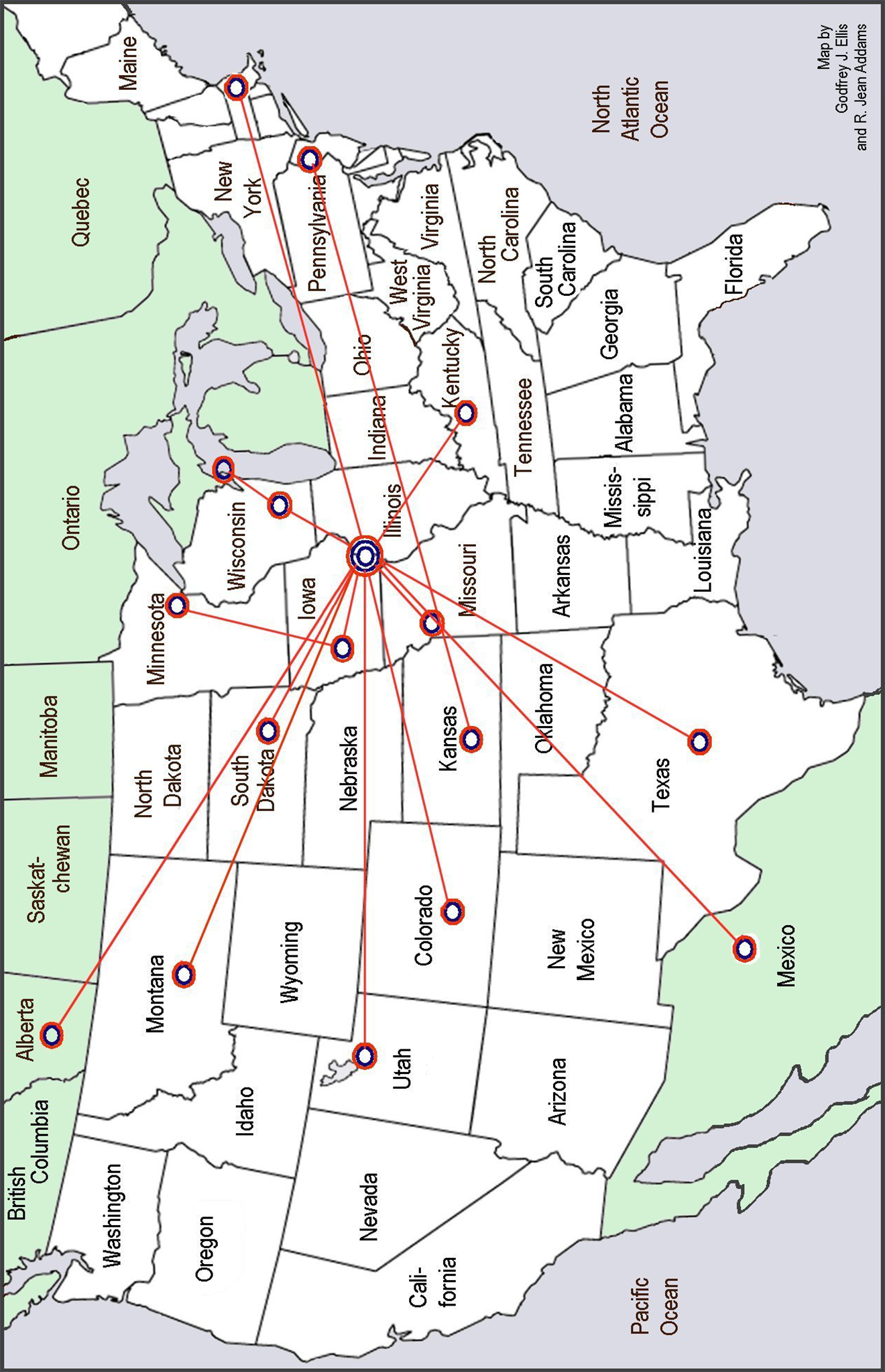 Other early gathering locations by the various expressions have included Pennsylvania, Iowa, Minnesota, Wisconsin, Michigan, and Kansas. Later subsequent gatherings by certain expressions have included locations in Montana, Arizona, Colorado, Texas, South Dakota, southern Alberta, southern Manitoba, and northern Mexico. Figure 1 shows the geographical location of many of the expressions.