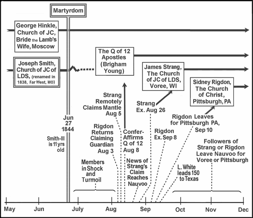 Joseph Smith introduced certain key ideas during the Nauvoo period (1839–44), specifically, actions for deceased ancestors such as temple ordinances (baptism for the dead and the endowment). The following brief paragraphs outline the positions taken by various early expressions vis-à-vis these practices and doctrines. Again, I note that while the names of various aspirants of these competing expressions will be mentioned, for the sake of presentation, these men will not be fully introduced until Part Two of this paper.