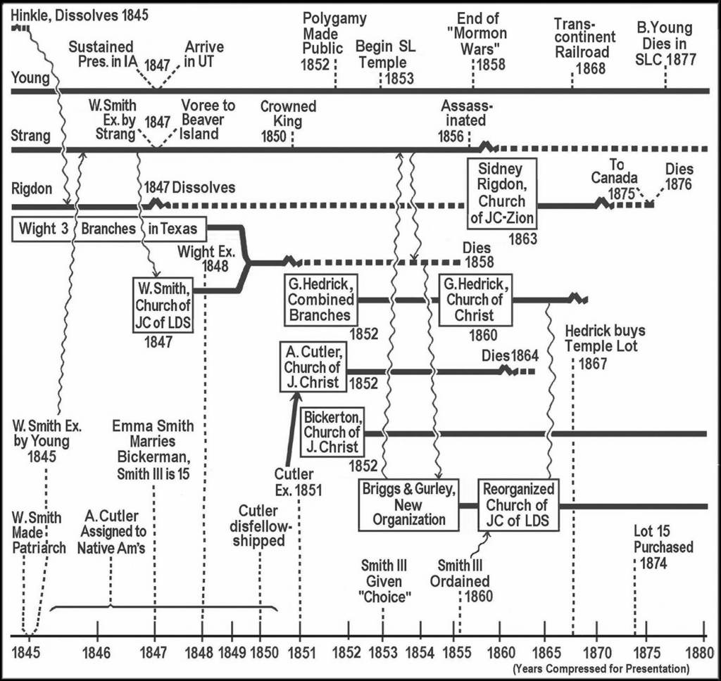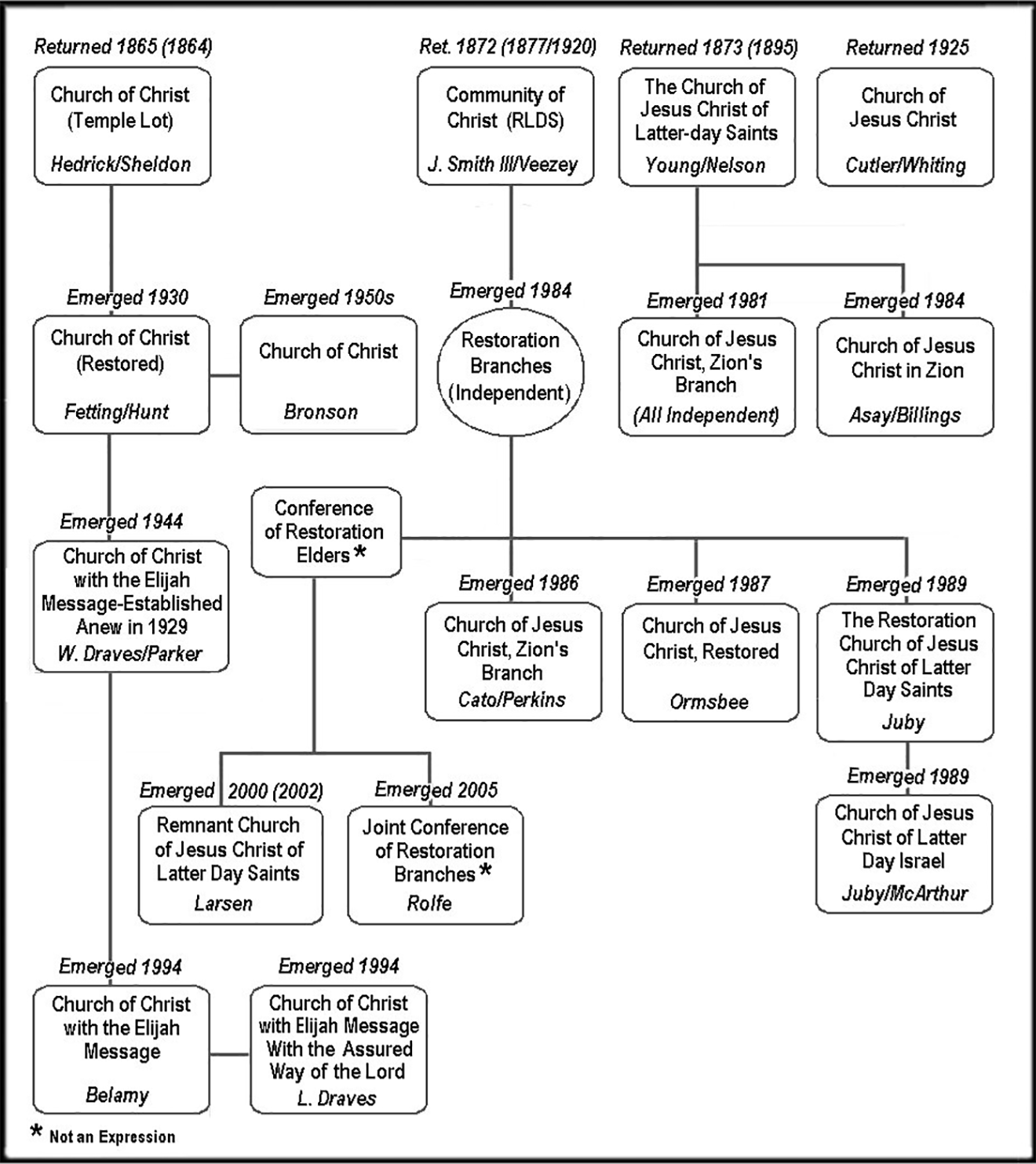 To avoid sensitivities with terms like off-shoots, splinter groups, and schisms, I use the word expression to refer to the separate organizations or associations that emanated from the original church. Most expressions either consider themselves the original church, or that their expression has been reconstituted or divinely separated. Each individual or aspirant and the expression associated with that person is listed below in table 1. Note, again, that the list is necessarily incomplete for this relatively short treatment of the topic.