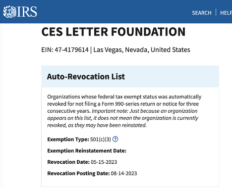 Figure 1. Screenshot showing the apparent revocation of the tax-exempt status of the CES Letter Foundation. If this is correct, it has yet to be acknowledged by the CES Letter Foundation on their website.