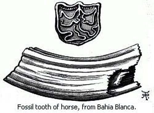 Figure 1. Illustration of fossilized horse tooth from Bahia Blanca, discovered by Charles Darwin. (Wikimedia Commons, s.v. “Fossil tooth of horse from Bahia Blanca—Charles Darwin,” commons.wikimedia.org/wiki/File:Fossil_tooth_of_horse_from_Bahia_Blanca_-_Charles_Darwin.jpg.)