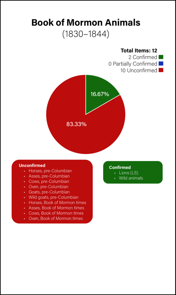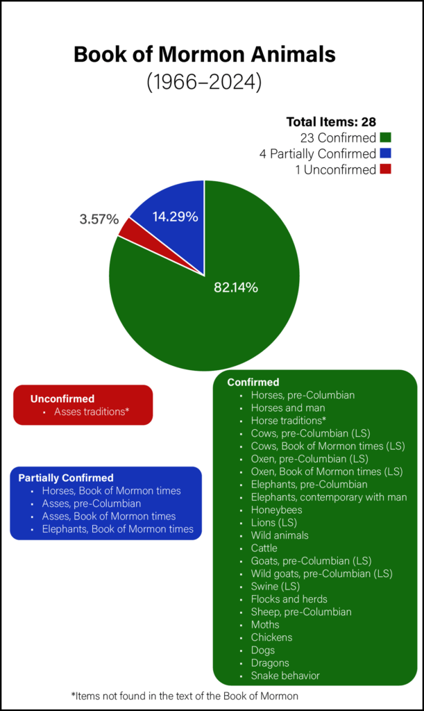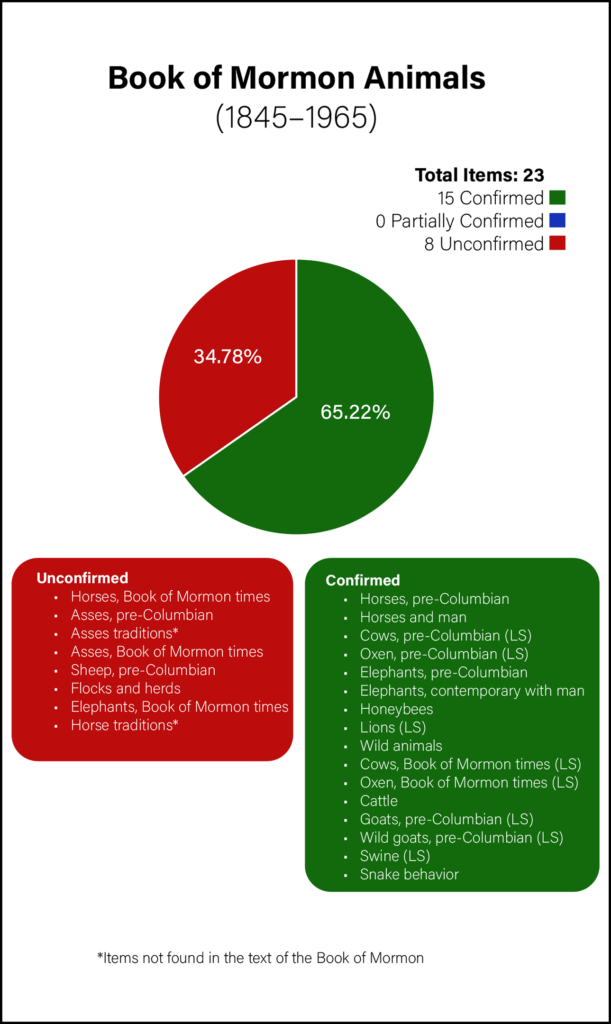 As shown in figure 12, between 1830–1844, twelve anachronistic items related to animals in the Book of Mormon had been mentioned by writers. By 1844, two of these had been confirmed and ten were unconfirmed. During the next 120 years, 1845–1965, the number of animal-related items rose to twenty-three. By 1965, sixteen of these items had been confirmed (figure 13). During the next fifty-nine years, 1966–2024, the total number of items had risen to twenty-eight, but twenty-three have now been confirmed (eight confirmed LS), and four of these have been partially confirmed, while one remains unconfirmed (figure 14).