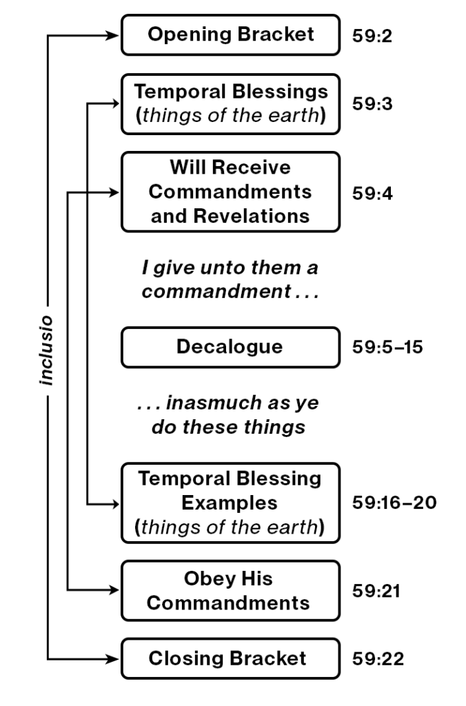 The strongest argument that the commandments presented in verses 9–14 are intended to be something unique and special is a typological one; the comparison between the soteriological testimony of the book of Deuteronomy, Nephi’s so-called “appendix” in the Book of Mormon, and section 59. The most important commandment in each of these texts is to “love the Lord” and the promised blessings in each of these texts are based on following this primary command and its derivatives. This command is repeated twice in Deuteronomy (6:1 and 11:1) and is bracketed by an inclusio that is thematically similar to the one bracketing section 59. It is significant that both section 59 and the Deuteronomist present Decalogues encased within inclusios with thematically similar keywords: “observe to do all the statutes and judgments” vis-à-vis “doeth the works of righteousness” (Deuteronomy 11:32 and Doctrine and Covenants 59:23).