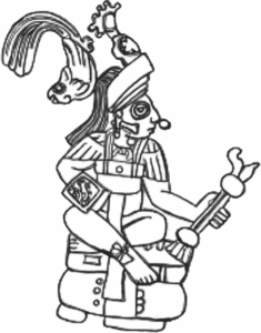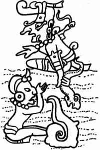 In figure 12,34 one of these accounts in the Popol Vuh of the Hero Twins is pictured on a Maya vase created hundreds of years before [Page 61]the K’iche’ Maya related their mythology to the Spanish. In this story told in the Popol Vuh, it was the intention of the Lords of Death in the underworld ballcourt of Xibalba, to kill the Hero Twins. However, the twins were exceedingly clever and knew of their design and devised a plan to trick the Lords of Death. The twins jumped into a fiery furnace. The Lords of Death threw their ashes into the underworld river, believing this was their demise. However, in a miraculous turn of events, the Hero Twins turned into “people-fish” and were subsequently reborn.35
