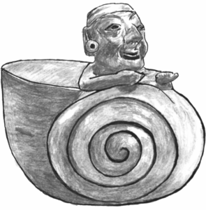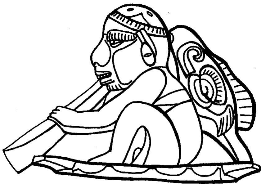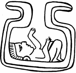 Figure 10. Aged man in shell of rebirth, Uaxactun, Guatemala. (Drawing by the author.)