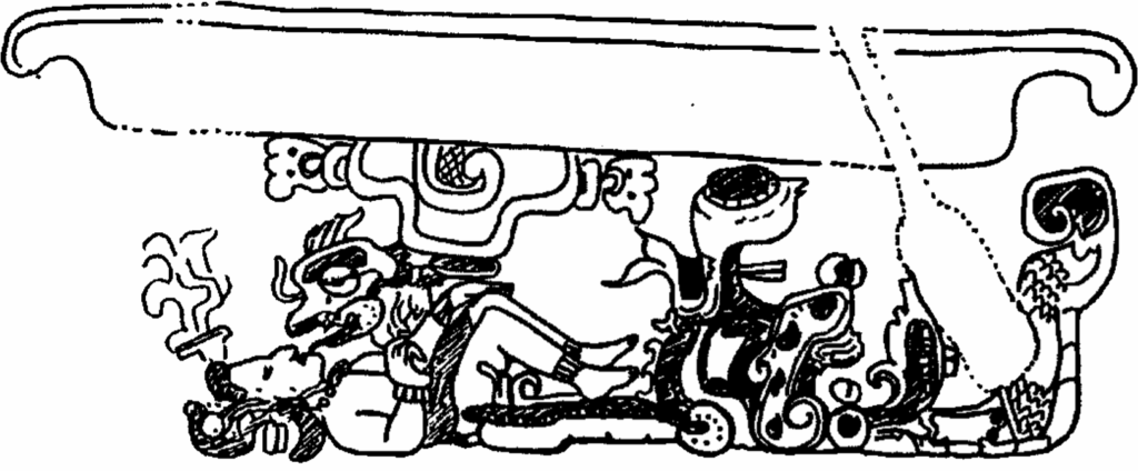Figure 3. Lineage founder K’inich Yax K’uk’ Mo’, Altar Q, Copan, Honduras. (Drawing by the author after Schele and Mathews, The Code of Kings, 134.)