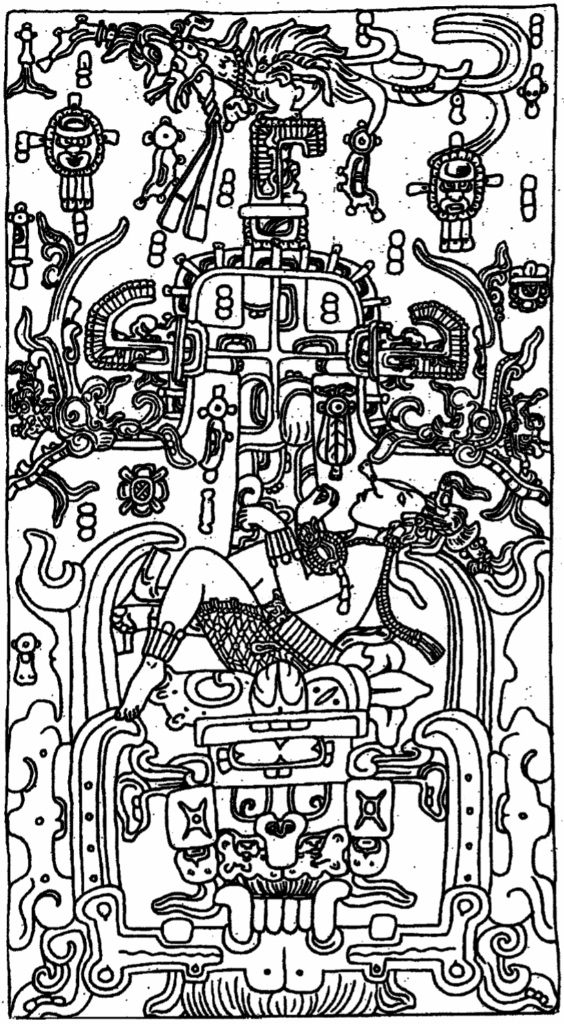 Figure 14. Sarcophagus lid of Kinich Janaab Pakal, Palenque, Chiapas, Mexico. (Drawing by Tom Weller. Permission granted for use of this illustration.)