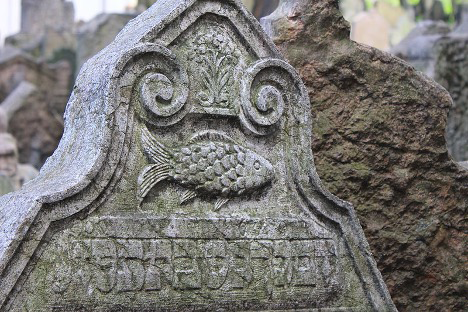 Figure 18. Example of tombstone with fish in the Old Jewish Cemetery in Prague, Czech Republic. (Photograph from Wikimedia Commons.)