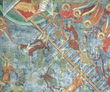 Figure 3. The Ladder of Virtues of St. John Climacus, north façade, Sucevita Monastery, Romania, 1602–1604.18 Note the sequence of virtues that label each rung of the ladder.