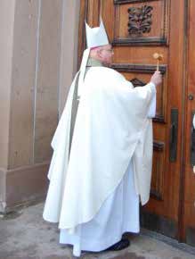 Figure 5. A new bishop knocks three times with a mallet on the door of the Cathedral as part of a Roman Catholic entrance ritual.
