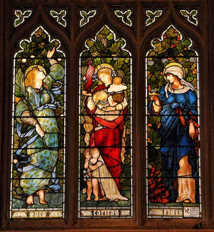 Figure 6. Sir Edward Coley Burne-Jones (1833-1898) and William Morris (I835-1896): Spes, Caritas, and Fides (Hope, Charity, and Faith), Christ Church Cathedral, Oxford, England. These three martyred saints, whose common mother was named Sophia (Wisdom) in some accounts, were said to have lived during the reign of the Roman Emperor Hadrian (2nd century ce).87
