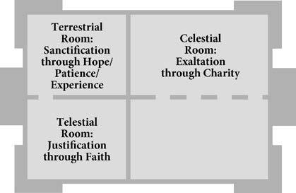 The journey into the Israelite temple proper commenced as the high priest left the courtyard to “draw near” to God in the Holy Place with “full assurance of faith,” having been cleansed through both the outward ordinances of sacrifice and washing and the inner transformations of repentance and spiritual cleansing from sin.198 The Holy Place can be compared to the “Terrestrial Room” in modern LDS temples,199 a representation of the greater glory that Adam and Eve experienced as they began the process by which “all things were confirmed unto Adam, by an holy [i.e., Melchizedek Priesthood] ordinance.”200 It is a place where disciples are meant to “wax stronger and stronger in their humility, and firmer and firmer in the faith of Christ, unto the filling their souls with joy and consolation, yea, even to the purifying and the sanctification of their hearts.”201 In that ritual and actual state of existence, they participate in further covenant-making and testing connected with the ordinances of the Melchizedek Priesthood to see whether they will “hold fast the profession of [their] faith [= Greek elpis, literally hope] without [Page 243]wavering.”202 For those who continue to the end of the high priestly way, the Terrestrial Room provides a transition to the Celestial Room. This transition, symbolizing the resurrection, takes place through the Veil of the Temple,203 “that is to say, [the] flesh [of the Jesus Christ, the Redeemer].”204