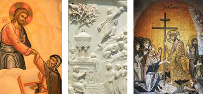 Figures 8a, 8b, 8c. a: Greek Orthodox Icon Depicting the Ladder of Virtues, Thessaloniki, Macedonia;221 b: The Woman at the Tomb and the Ascension, ca. ce 400;222 c: Anastasis, Daphni Monastery, near Athens, Greece, ce 1080–1100.223 In many depictions of the ladder of virtues, Christ is positioned at the top of the ladder taking the ascending disciple by the wrist (a). A similar gesture is shown in b, where Christ Himself is welcomed to heaven after His ascension. In c, Nicoletta Isar brilliantly concludes that the gesture of the hand of Christ grasping the wrist of Adam, “an anchor…sure and stedfast”224 that binds them together in unbreakable fashion, represents not only the “meeting ground of both life and death,” but also serves as a “visual metaphor of the…nuptial bond,”225 an equally indissoluble union, “the conjugal harness by which both parts are yoked together.”226 This metaphor is visually highlighted by the stigma on the hand of the Savior that is carefully positioned at the exact center of the image to overlay precisely both the cross of Christ and the wrist of Adam.227