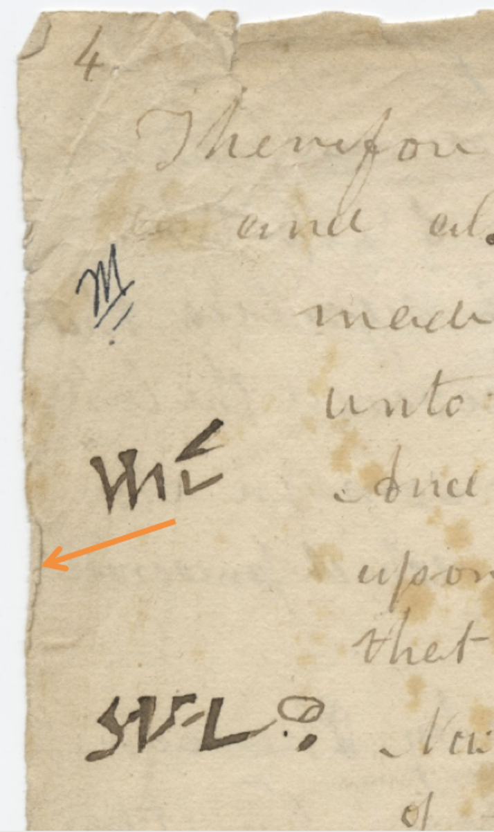 Finally, the volume editors raise the issue of joins, but their statements need to be examined. Although the volume editors raise the issue, their simultaneous dictation theory does not depend on it. The simultaneous dictation theory could still be true even if their observations about manuscript joins were false.Manuscript joins are very important in work with fragmentary documents.52 In this case, the join tells us less about the document and more about the source of the paper for the documents. A number of ledger volumes had been purchased,53 some of which were mined for paper by taking quires and cutting the larger folded sheets apart at the fold in the gutter. Indeed, although unnoted by the volume editors, the ledger volume containing the Grammar and Alphabet document has indications that at least one quire has been removed from the volume. Since the cuts were freehand, there are irregularities that allow for different parts of an original leaf to be matched together to [Page 143]show they were once together. There is no real meaning to this phenomenon, since the main purpose was simply getting usable sheets of paper. The volume editors, however, try to use this to hypothesize that two manuscripts that both have one page from an originally larger sheet of paper were created at the same time. I have long been interested in the phenomenon of joins since I first noticed it and pointed it out to Hauglid. At the time, I could not find any other joins between manuscript sheets when looking at the originals, so their announcement that the second leaves also joined came as a surprise, since I had checked that in the originals and had not found that to be the case.The volume editors use the term leaf to refer to a sheet of paper. They use the term page to refer to the side of a leaf. Each leaf has two pages: the front side (called the recto) and the back side (called the verso).The volume editors are correct in the first half of their statement. The first leaf of what they call Book of Abraham Manuscript–A originally joined to the first leaf of what they call Book of Abraham Manuscript–B before being separated. The rectos were on the same side of the original sheet. The separate leaves, however, were originally oriented upside- down to each other so the left sides of the rectos of the two leaves join. The divergent orientation as well as the formatting for each leaf indicates that the leaves were separated before they were inscribed.The volume editors, however, are not correct in their assertion that the second leaves in each manuscript were also joined. In what they call Book of Abraham Manuscript–A, the second leaf (comprising the third and fourth pages) has excess paper on the cut edge (which is the right edge of the recto or left edge of the verso) that has been folded over and is visible only from the verso. This material (approximately 1 mm wide in the photograph) appears along the left-hand edge between 3.5 and 5 cm from the top edge in the photograph.54 A portion of the corresponding image from the Joseph Smith Papers website is shown in Figure 1 with an arrow marking the folded-over excess paper. No corresponding lack of paper, or nick, appears in any potentially corresponding edge of the second leaf of Book of Abraham Manuscript–B as would be necessary if the second leaves also joined.55 Contrary to the assertions of the volume editors, these two leaves were not originally joined.