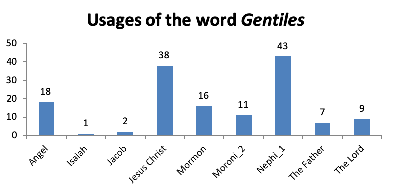 From Table 1 and Chart 2 (next page), we can see that Book of Mormon speakers did not say Gentiles evenly. Some speakers said the word much less often than others. The angel that taught Nephi1 in 1 Nephi 11-14 used Gentiles much more frequently than we would expect given the relatively few words he spoke; moreover, his use of Gentiles was not evenly [Page 274]distributed. He did not use the word at all in 1 Nephi 11-12 (the first half of his discussion with Nephi1), and he used it only four times in chapter 14. His heavy use of Gentiles can be seen as he prophesied in 1 Nephi 13 about latter-day events on the American continent. Nephi1, a major author, also said Gentiles more than we might expect. He frequently used Gentiles in his interchange with the angel; nearly one-fourth of all occurrences of Gentiles in the Book of Mormon appear in 1 Nephi 13.