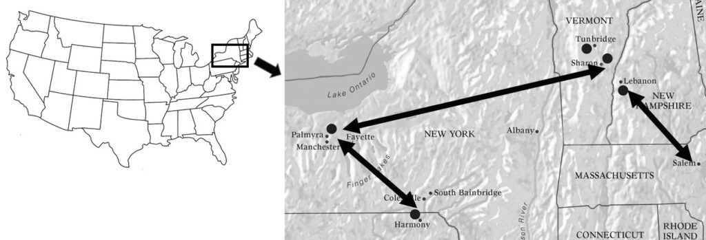 Figure 1. Arrows show Joseph Smith’s pre-1829 travels and the six locations where he attended or may have attended local district schools.