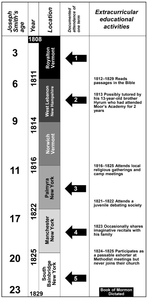 Between 1808 and 1826, Joseph Smith attended local common schools in five or six areas.12 District schools held two terms each year (summer and winter), and his attendance during at least one term can be documented in Royalton, Vermont (1809–1812); West Lebanon, New Hampshire [Page 5](1812–1815); and Palmyra (1817–1821), Manchester (1821–1825), and South Bainbridge (1825–1826), New York.13 (See Figure 1.) Researcher William L. Davis observes that Joseph may have been eligible to attend up to twenty-two terms between 1809 and 1826. Although the exact number he attended continues to be debated, Davis speculates that Joseph Smith’s “overall estimated time … in formal education” (beyond the five terms documented in the historical record) was “equivalent of approximately seven full school years,” or fourteen terms.14