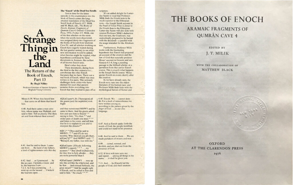 In 1976–77, Hugh Nibley dashed off one long, heavily footnoted article after another each month for a series about ancient Enoch manuscripts and Moses 6–7 that was running in the Church’s Ensign magazine. As he was finishing the last article in the series, he received—“just in time”18—an anxiously awaited volume describing fragments of Aramaic books of Enoch that were found among the Dead Sea Scrolls.19 Among other texts, the book, edited by non–Latter-day Saint scholars J. T. Milik and Matthew Black, contained the first English translation of BG20. So impatient was Nibley to study it that it it seems he may have borrowed a copy from the University of Utah while he waited for his own copy to arrive.21