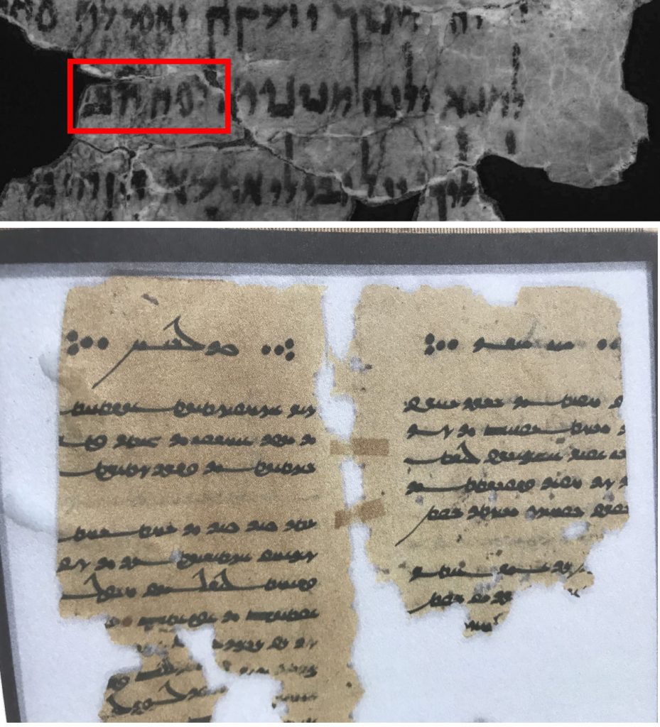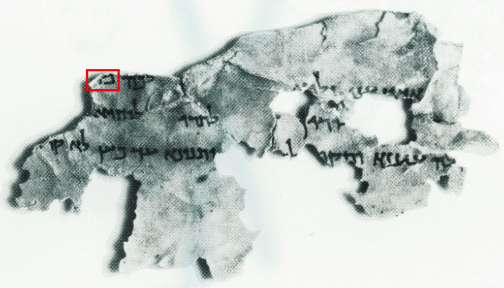 Figure 10. Fragment of the Qumran Book of Giants (4Q203) that was understood by Milik and Black to contain the first part of the personal name Mahaway (outlined by a rectangle in the upper left of the photograph).160 BYU professor Hugh Nibley was the first to argue that Mahaway (MHWY) is related to Mahijah (MHYY or MḤYY)161 and Mahujah (MHWY or MḤWY)162 in the Book of Moses.163