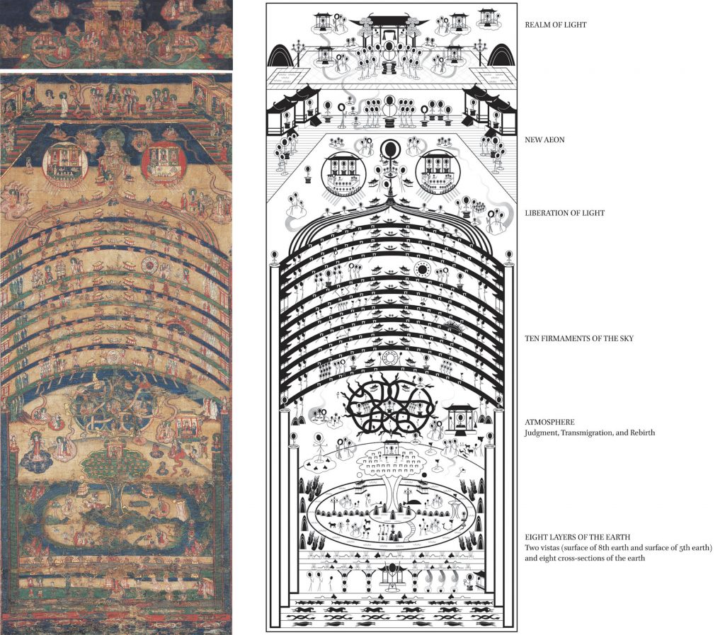 One of the most significant examples of new discoveries relating to the Book of Moses Enoch story is the collection of BG elements that relate to the report in Moses 6–7 that Zion, the righteous city of Enoch, was “received . . . up into [God’s] own bosom” (Moses 7:69). Though scholars have been aware for some time of suggestions in a Mandaean Enoch fragment37 and in late midrash38 that a group of Enoch’s followers were taken up to heaven with him, until recently no ancient evidence had surfaced for the idea that Enoch’s followers had been led to establish a place of gathering—an earthly Zion—beforehand. Recently, however, it was noticed that a fragment of a Manichaean version of BG describes how the righteous who had been converted by Enoch’s preaching were separated from the wicked and gathered to divinely prepared cities in westward lying mountains.39 This event recalls the statement of Moses 7:17 about the gathering of Enoch’s Zion, when his people “were blessed upon the mountains, and upon the high places, and did flourish.” Moreover, elements of the Manichaean Cosmology Painting (MCP), a visual representation that Enoch scholars have concluded contains depictions relevant to many events of BG, suggest that the inhabitants of those cities were ultimately taken up to dwell in in the presence of Deity.40 This motif recalls the Book of Moses statement that the inhabitants of Zion were “received . . . up into [God’s] own bosom”(Moses 7:69). [Page 105]Further discussion of this and other ancient affinities between BG and Moses 6–7 will be discussed later, in sections 3–6 of this chapter.Before entering into further discussion of resemblances of BG to Moses 6–7, additional discussion on the background on BG will be provided below.
