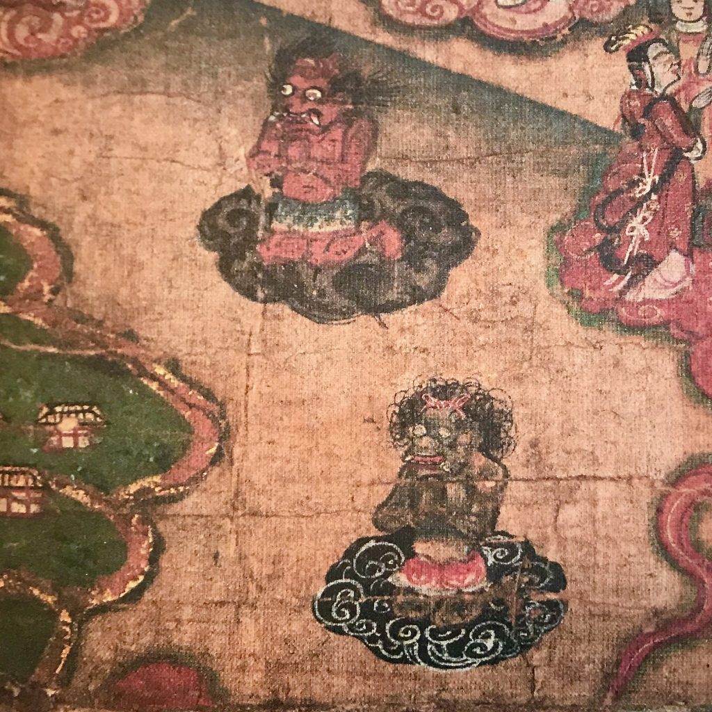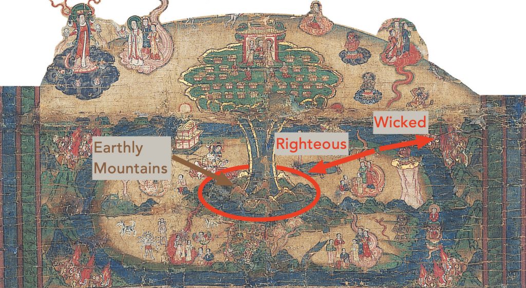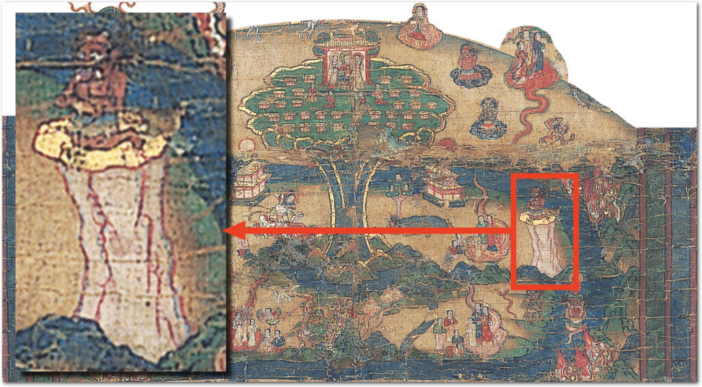 A third demon inhabits a mountaintop. This demon is shown kneeling atop the gold highland of a mountain, the sides of which are defined similarly to the sides of Mount Sumeru.