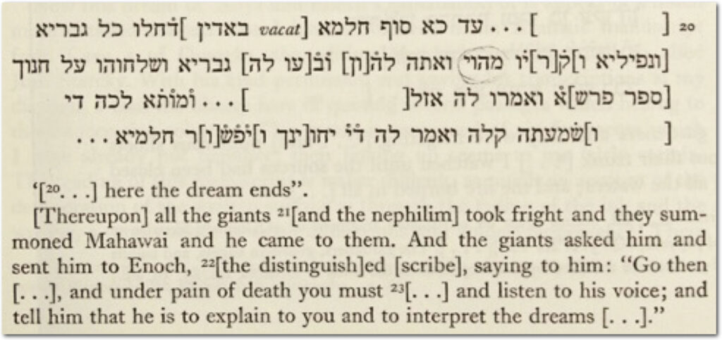 Figure 2. The passage shown comes from Milik and Black’s translation of BG, 4Q530, fragment 2, column ii, lines 20–23. It tells of an incident when the wicked ʾOhyah, Hahyah, and their fellows send Mahawai to ask Enoch about their frightful dreams of pending destruction. This copy of the book is located in the Hugh Nibley Ancient Studies Room of the BYU Harold B. Lee Library. Note that Nibley circled the Aramaic version of the name Mahawai in pencil.24