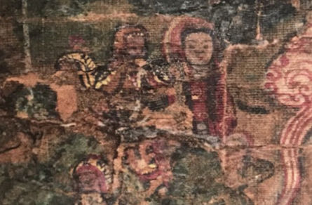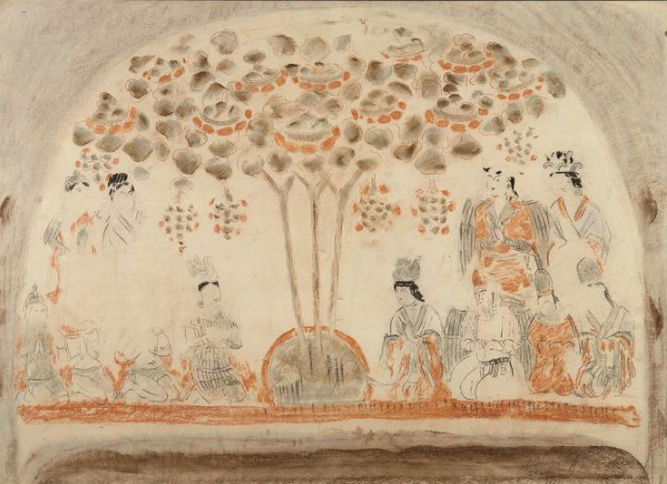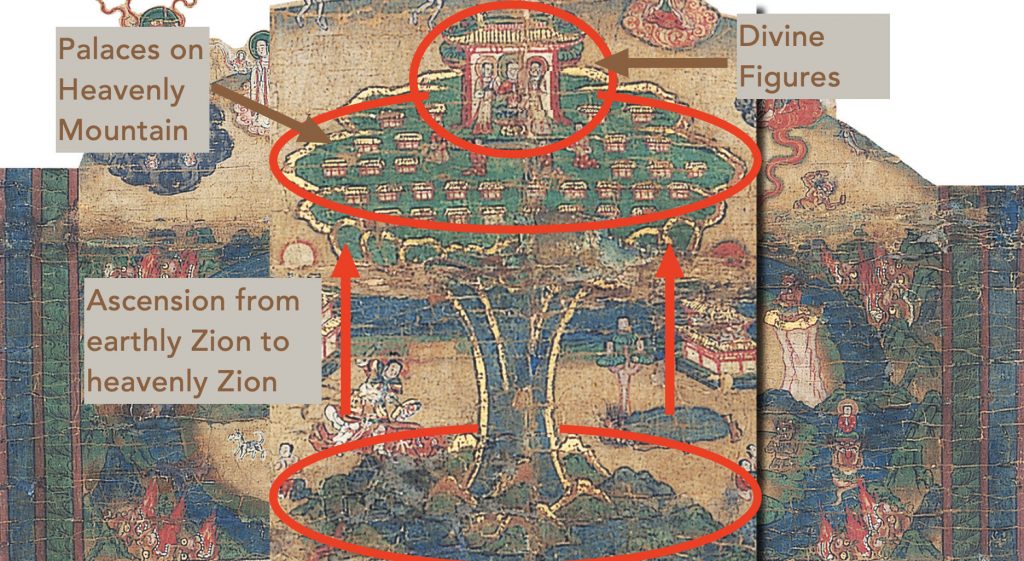 Figure 6. Painting of the Uygur Manichaean-Buddhist mural of the three-trunked “Jewel Tree” from Bezeklik Thousand Buddha Caves, Cave no. 25 (no. 38 in the modern Chinese numbering system), Flaming Mountains, China, ninth–tenth century.109 For many years, scholars mistakenly interpreted the tree as portraying an element of the dream of the gibborim in the Book of Giants, where the flourishing tree with three trunks was seen as representing the idea that only Noah and his three sons would escape the Flood.110