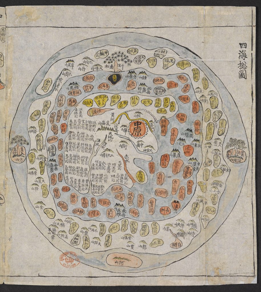 The concentric circle structure of the map and many of the mythological names come from the Chinese Shan Hai Jing (The Classic of Mountain and Seas), a text that was probably compiled from older texts in the first or second century BCE. For detailed background on these and similar maps, see Oh, “Circular World Maps.” Among other things, Oh establishes the fact that even though such maps are round, they do not depart from the traditional “square earth-round heaven” principle. The circular form of the map represents the round shape of heaven.For a general introduction to cartography and the cosmic ocean in the ancient Near East, see Wyatt, Space, 80–88, 113.