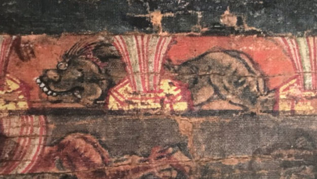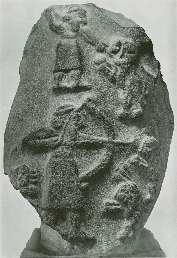 Figure 5. Fragmentary lion-hunting scene from Uruk, ca. 3200 BCE, on display at the Iraq Museum in Baghdad, Iraq. The scene shows “a bearded figure wearing a diadem that appears twice; one at the top killing a lion with a spear and once below killing lions with bow and arrow.”81