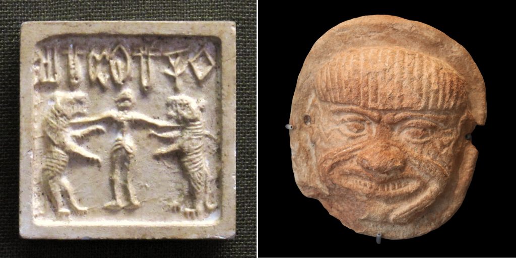Figure 8. a. Indus Valley civilization “Gilgamesh” seal showing a “Master of Animals” motif—a figure between two tigers (2500–1500 BCE);132 b. Head of Ḥumbaba, second millennium BCE.133