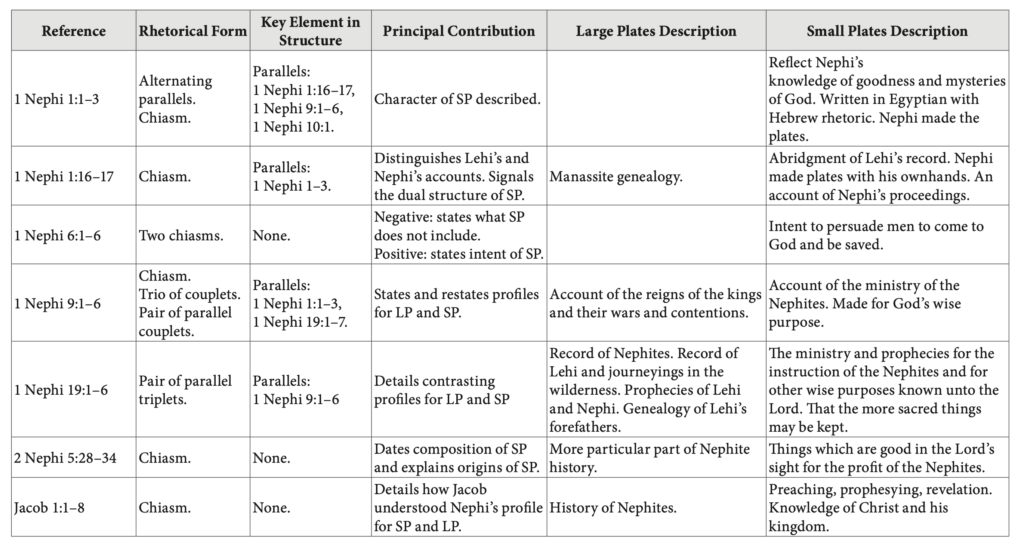 Readers of the Book of Mormon commonly assume the adequacy of a simple and straightforward explanation for the existence of Nephi’s Small Plates (sometimes abbreviated herein as SP).2 As explained at various points in the text, Nephi had undertaken a shorter version of his Large Plates (LP) record by selecting out the spiritual teachings, prophecies and revelations for a more focused presentation. But the adequacy of that explanation has come under considerable strain from two very different directions. In 1986 Fred Axelgard advanced the idea that the description provided for the Large Plates of Nephi as being more historical also applied to all of First Nephi and the first five chapters of Second Nephi.3 And now in an as yet unpublished working paper, I am advancing a new paradigm for interpretation of the Small Plates that both supports and pushes well beyond the traditional analysis by emphasizing Nephi’s use of Hebrew rhetoric4 to structure all of First [Page 101]and Second Nephi as a carefully calculated expansion and elaboration of Lehi’s vision of the Tree of Life.5 In this essay I will explain why Nephi provides so many versions of his explanations for the Small Plates by showing how these repeated passages provide key pieces of Nephi’s rhetorical structures.6 Finally, the information will be condensed into a table that displays the multiple ways in which the seven different profiles for Nephi’s two sets of plates are composed and related.