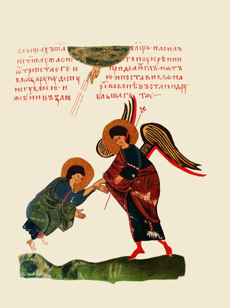 More generally, in Christian iconography this gesture is used in scenes representing a transition from one state or place to another. For example, a depiction at the Church of San Marco in Venice shows God taking Adam by the wrist to bring him through the door of Paradise and to introduce him into the Garden of Eden.86 Another Christian scene shows God taking Adam by the wrist as he and Eve receive the [Page 174]commandment not to partake of the Tree of Knowledge.87 Likewise, scripture and pseudepigrapha describe how prophets such as Enoch,88 Abraham,89 Daniel,90 and John91 are grasped by the hand of an angel and raised to a standing position in key moments of their heavenly visions.92