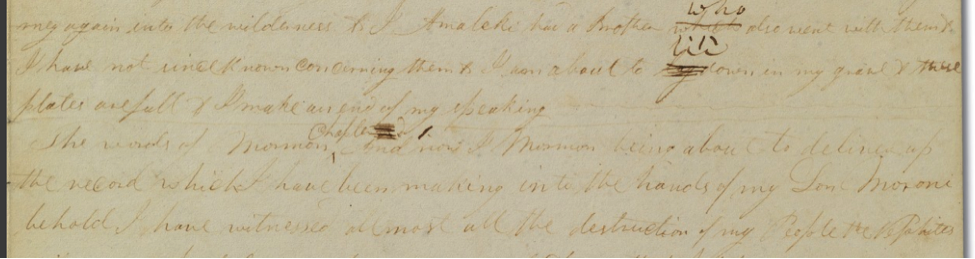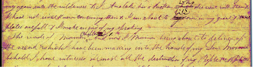 This resource, together with your analysis of the Roman numerals in the printer’s manuscript have convinced me that the “III” on page 117 of the printer’s manuscript is indeed a later revision by an unknown hand. It would appear that in this location, as in many others, the original manuscript contained only an indication of a chapter break. This indication was copied from the original manuscript to the printer’s manuscript. The Roman numeral III was added later. Had I known of this additional evidence when writing my paper, I wouldn’t have suggested that the number III came from the original manuscript. This additional evidence, however, doesn’t materially affect the rationale of the paper or its conclusions. The retained segment of the original manuscript remains the most likely source for the original number 2d in the previous chapter from which the original number III flowed. All other evidence discussed in the paper, including this number 2d, still firmly supports a conclusion that the chapter we call Words of Mormon was the original second chapter of Mosiah.