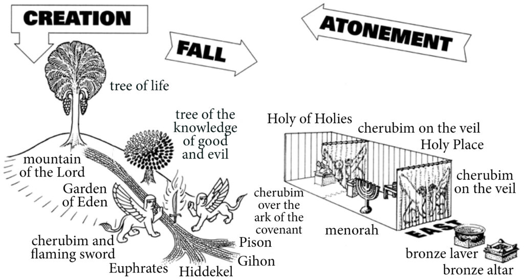Once a year on Yom Kippur, the Day of Atonement, Adam’s eastward expulsion from the Garden is reversed when the high priest travels west past the consuming fire of sacrifice and the purifying water of the laver, through the veil woven with images of cherubim. Thus, he returns to the original point of creation, where he pours out the atoning blood of the sacrifice, reestablishing the covenant relationship with God.16