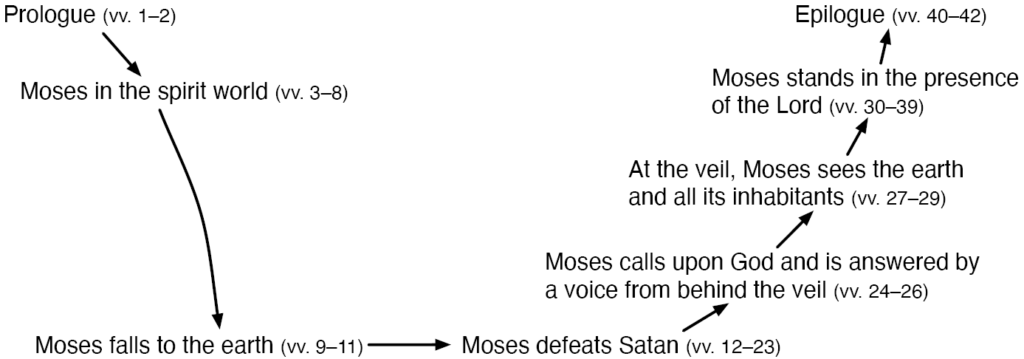 In Moses 2–4 is found the story of the “down-road,” while chapters 5–8 follow the journey of Adam and Eve and the righteous branches of their posterity along the “up-road.”18 In Moses 4:31, the “up-road” is called the “way of the tree of life”19—signifying the path that leads to the presence of God and the sweet fruit held in reserve for the righteous [Page 69]in the day of resurrection. The down-road and the up-road are prefigured in the prophetic experience described in Moses 1 (fig. 2), which serves as a prologue to the Book of Moses as a whole.