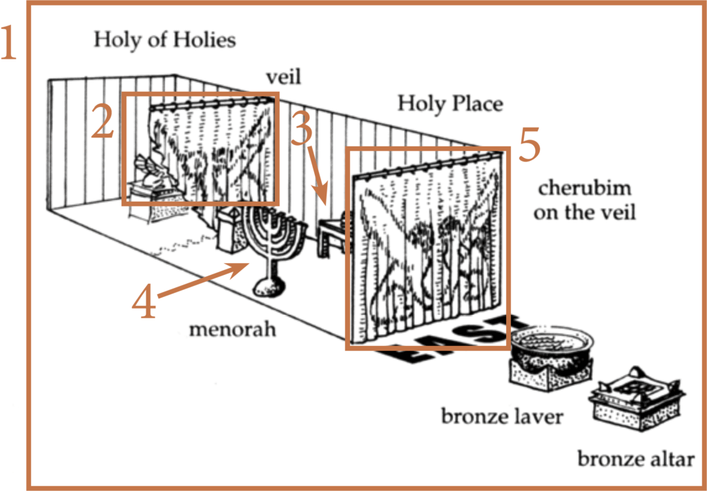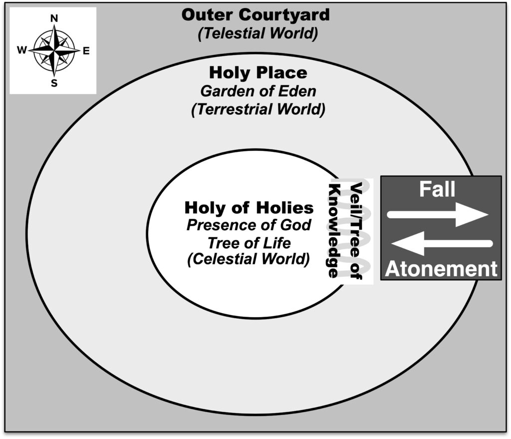 The movements of Adam and Eve between different areas of the Eden “temple” are best understood through a top-down view. The inward/outward movement in figure 4 corresponds to the upward/downward orientation of figure 1. Consistent with strands of Jewish tradition and the views of Ephrem the Syrian, a fourth-century Christian, the tree of knowledge is pictured “as a sanctuary curtain hiding the Holy of Holies, which is the Tree of Life higher up.”30