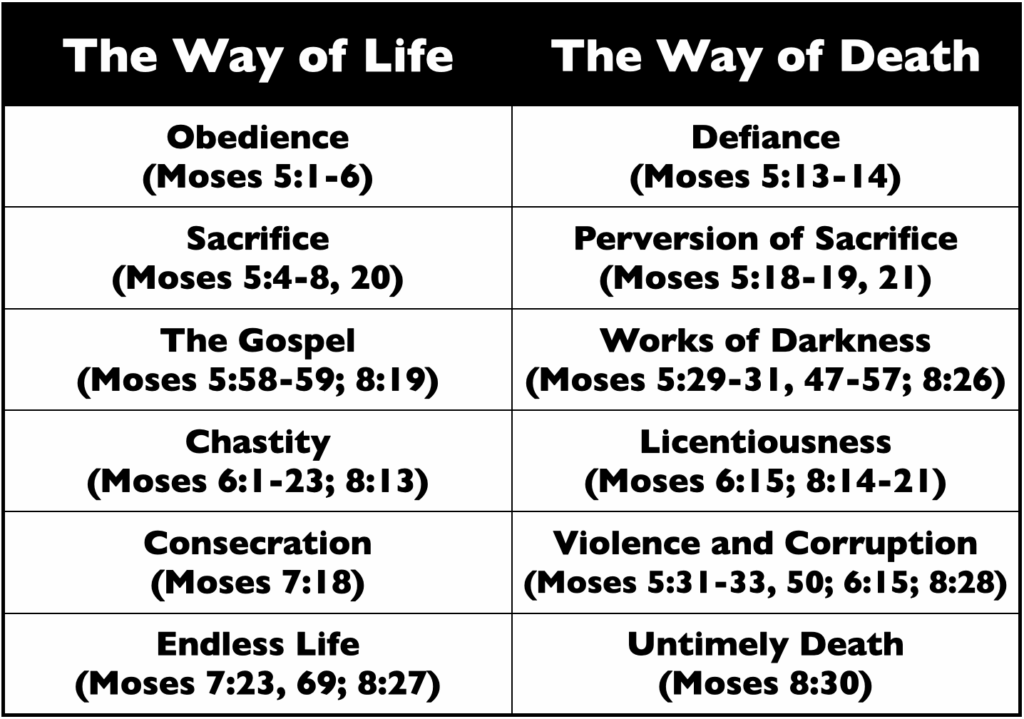 Figure 6 illustrates the progressive separation of the “two ways” due to analogous sequences of covenant keeping and covenant breaking highlighted in the Book of Moses.39 An interesting aspect of looking at the history of Adam through Enoch as a temple text is that—like the Sermon on the Mount, the Sermon at the Nephite temple, and the biblical text of the Primary History—the series of covenant-related themes unfolds in what appears to be a definite order of progression. Moreover, the ultimate consequences of both covenant-keeping and covenant-breaking are poignantly illustrated at the conclusion of the account: in the final two chapters of the Book of Moses, Enoch and his people receive the blessing of an endless life as they are taken up to the bosom of God (Moses 7:69), while the wicked experience untimely death in the destruction of the great Flood (Moses 8:30).40