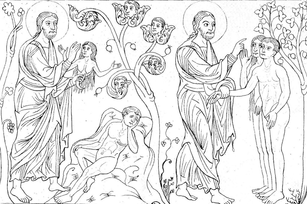 Figure 7 depicts the creation of Eve as well as Adam and Eve receiving the “first commandments” (Alma 12:31) that were given before the Fall. Gary Anderson points out an interesting divergence between the Genesis story and the drawing: “Whereas Genesis 2 recounts that Adam was created first (Genesis 2:4–7), given a commandment (Genesis 2:16–17), and only then received a spouse (Genesis 2:19–24), the Hortus Deliciarum has it that Adam was created, then Eve was drawn from his rib, and finally both were given a commandment.41