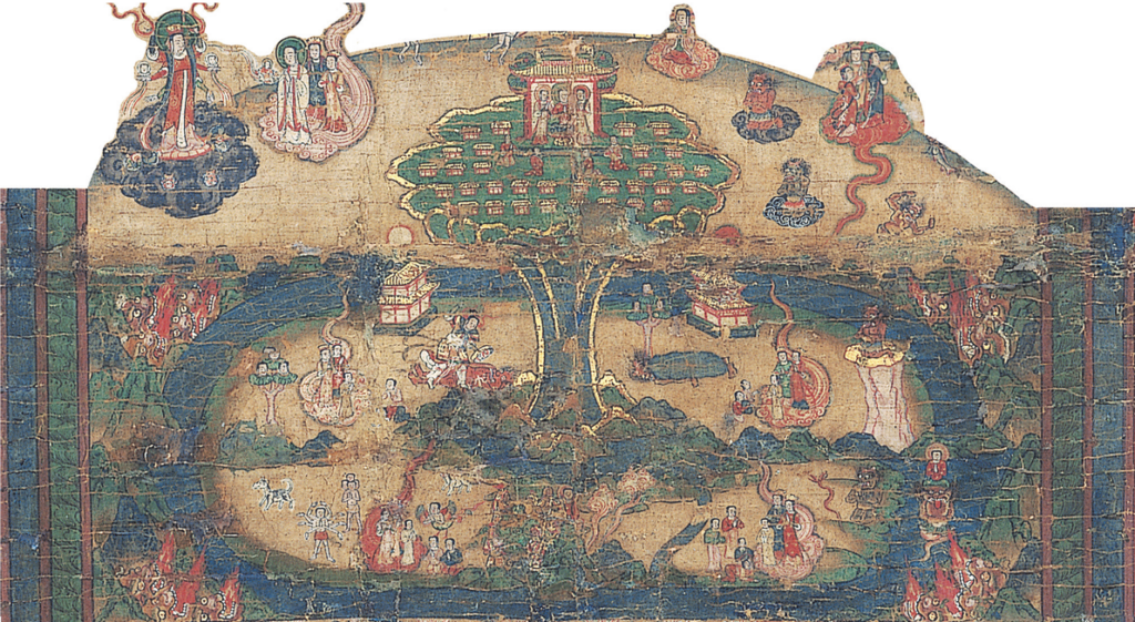 Figure 11. Detail of a wall hanging illustrating a Manichaean account of Enoch showing palaces at the top of a tree-like sacred mountain that surround a larger palace of Deity. Corresponding texts seem to describe events similar to the Book of Moses story of how Enoch and his people ascended to the bosom of God.59