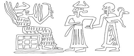 Figure 1. Akkadian cylinder seal showing a presentation scene, ca. 2300 bc. An interceding deity leads a supplicant by the hand into the presence of the sun god Shamash; the supplicant holds a caprid to present as an offering. Redrawn by the author from Henri Frankfort, Cylinder Seals: A Documentary Essay on the Art and Religion of the Ancient Near East (London: Macmillan, 1939), pl. 18e.