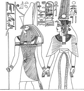 Figure 2. Scene from the tomb of Nefertari, Thebes, ca. 1200 bc. The god Horus, son of Isis, leads the queen Nefertari by the hand into the presence of the deities Re-Horakhty and Hathor. Redrawn by the author from Zahi Hawass, The Royal Tombs of Egypt (London: Thames and Hudson, 2006), 256.