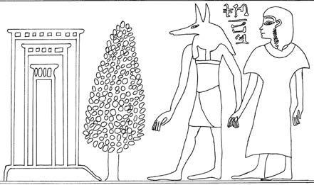 Figure 3. Vignette from the Book of the Dead, Spell 117. The god Anubis leads the deceased person by the hand toward a false door that leads to the presence of Osiris. From the papyrus of Nakht (BM 10471). Redrawn by the author from Raymond O. Faulkner and Carol Andrews, The Ancient Egyptian Book of the Dead (Austin: University of Texas Press, 1990), 112.