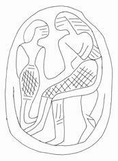 Figure 5. Hyksos scarab seal showing a figure seated on an animal-legged throne, clasping hands with a standing figure. Redrawn by the author from Fiona V. Richards, Scarab Seals from a Middle to Late Bronze Age Tomb at Pella in Jordan (Fribourg: University Press, 1992), pl. 3.