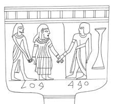 Figure 6. Phoenician ivory fan handle. A figure on the right (possibly a deity or a priest) clasps hands with a man (possibly Abdibaal, the owner of the fan, whose name is given in the inscription at the bottom) across what appears to be a curtain or veil. On the left is an attendant. The incense altar at the far right indicates that the scene takes place at the temple. Redrawn by the author from Karl P. Katz, P. P. Kahane, and Magen Broshi, From the Beginning: Archaeology and Art in the Israel Museum, Jerusalem (New York: Reynal and Company, Inc., 1968), 76.