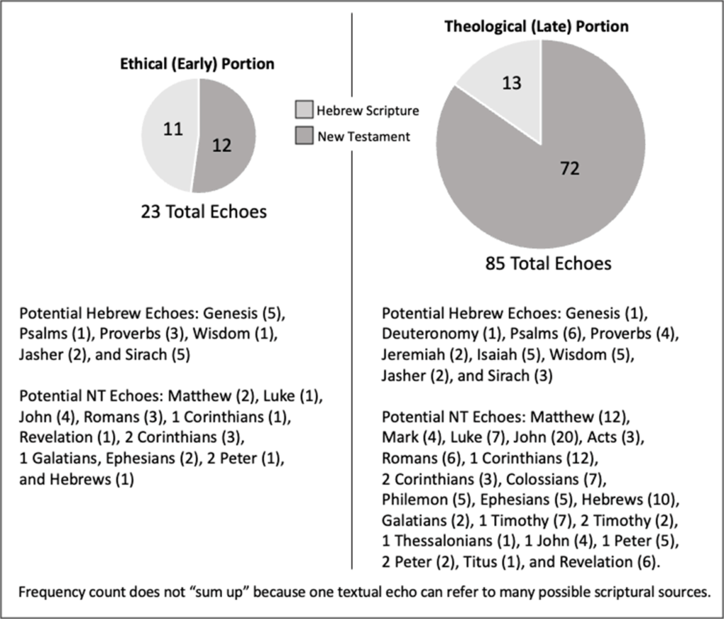 The two parts of Silvanus also exhibit noticeably different awareness and usage patterns of scriptural texts, particularly the New Testament (see Figure 1).48 With such an early proposed composition time frame, it is unclear how aware the author of the first portion of Silvanus was of the entire New Testament library. The Hebrew Bible and Jewish wisdom texts49 are as likely to be referenced in this part of Silvanus as the New Testament and, importantly, there are no direct New Testament citations and only a small number (12) of “possible or general echoes.”50 For example, there is some commonality between Silvanus 88, 15–16, which reads “live in Christ and you will obtain treasure in heaven,” and New Testament passages that also reference “treasure in heaven” (Mark 10:21, Luke 18:22). But it is difficult to definitively determine which, if any, of the books of the New Testament the first author might or might not have had access to.51 This is to be expected if, as the multiple source [Page 25]argument suggests, the first portion of Silvanus was written prior to the canonization of the New Testament texts.