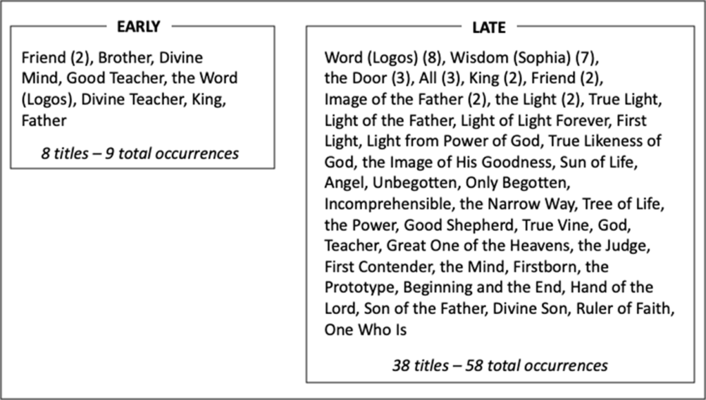 So what are these differences? First, both portions of Silvanus write about Christ in a manner fitting to their compositional time periods. Take, as an example, the titles each author ascribes to Christ (see Figure 2). The early author, in nine mentions of Christ, employs eight titles; describing him as friend, brother, good teacher, and father.106 In contrast, the second author mentions Christ 58 times and uses [Page 40]a staggering 38 different titles to describe him.107 This is indicative of the later time period in which this author writes. According to Van Den Broek “before Origen, similar lists are very rare, after him they are very frequent, especially in the fourth century.”108 Just to illustrate how voluminous and possibly even superfluous this list of titles is, I’ve used the Book of Mormon as a comparative text. In 531 pages, the Book of Mormon uses 67 different titles for Christ (at a rate of one title for every 7.9 pages of text).109 The second portion of Silvanus, in comparison, gives 38 different titles to Christ in just 13 equivalent pages (a rate of one title for every 0.34 pages of text). The second author seems especially interested in the metaphor of light as a way to describe Christ. Christ is the Sun of Life, the Light, the True Light, the Light of the Father, the Light of Light Forever, the First Light, and the Light from the Power of God.