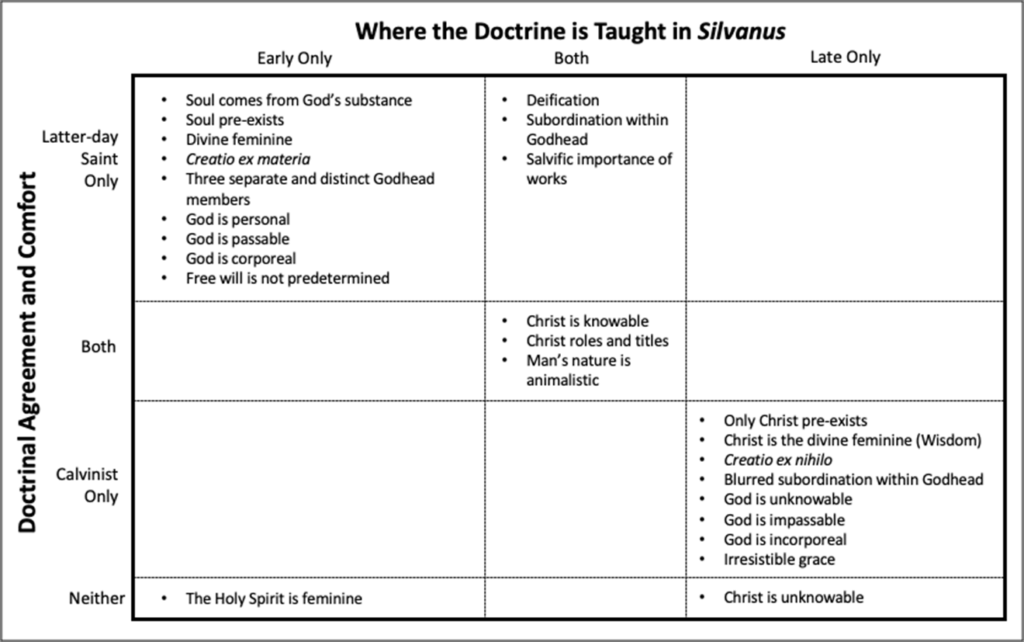 Figure 4 portrays my assessment of the comparability between Latter-day Saint and Calvinist beliefs with the early and late Silvanus authors. According to this assessment, Restored Church beliefs are [Page 70]generally compatible with nearly all of the early Silvanus author’s doctrinal positions; there is only one single notable exception, the early author’s suggestion that the Holy Spirit is feminine.197