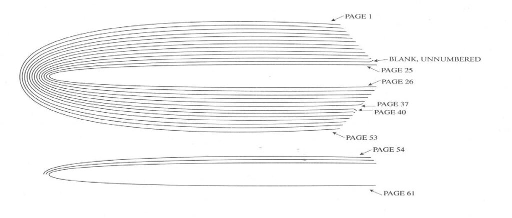 The makeup of Old Testament 1 as a physical artifact leads to questions. The bulk of it consists of a large gathering of sheets of paper. To make such a gathering, thirteen loose sheets of foolscap paper (ca. 16 x 13 inches) were folded in half and stitched in the middle to make a booklet of fifty-two pages. Normally, the writing would be placed on the pages after the booklet was created, but it is possible that sheets were folded and placed inside as the writing progressed, and there is no way to know at what point the stitching was added. These uncertainties are relevant, because they speak to the issue of whether the Prophet anticipated a large writing project when the words were placed on the first page (whether it was the dictated manuscript or not). The gathering begins with the Visions of Moses, and the last page ends at Genesis 21:29.13