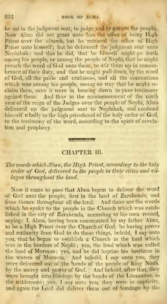 Figure 2. Page 232 from the 1830 Book of Mormon showing a heading for Alma chapter III (current chapter 5).