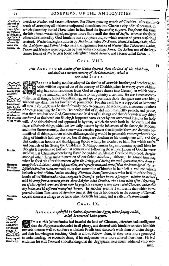 Figure 3. This page from Famous and Memorable Workes of Josephus shows chapter headings originally included by Josephus in the first century and marginalia summaries by the translator, Thomas Lodge.14